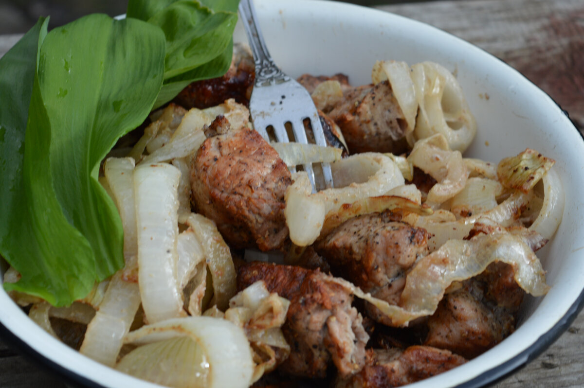 Вам ещё не надоел шашлык? А если приехали и сразу хочется жареного мяса? Мы никогда не заквашиваем шашлык за сутки. И он у нас всегда получается мягкий и сочный. Обычно на шашлык мы берем окорок или лопатку. Шейка слишком жирная, а карбонат получается сухим. На троих взрослых нам хватает 0,8-1 кг мяса. Одно время брали вакуумные упаковки типа "Ближние горки", или "Слово мясника". Но последние раза качество сильно упало. Последний раз оказался просто кусок подчревка. Не надо осуждать меня за государственное мясо. Мы живем в городе и другого здесь нет. А если и есть, то очень дорого. Мясо режем на куски, учитывая ветер. При сильном ветре куски режем мельче, иначе в таких условиях не прожарится. Засыпаем все специи, одну треть столовой ложки соли. Добавляем крупными кольцами нарезанный лук. Чеснок мелко режем. Все тщательно перемешиваем, давя на лук, чтобы он пустил сок. Накрываем ёмкость с шашлыком тарелкой, придавливаем, сверху ставим пятилитровую бутылку с водой или кастрюлю. Остав