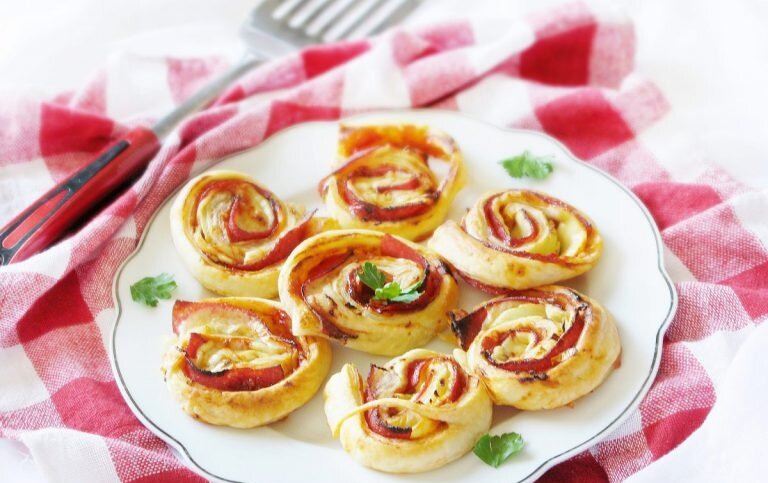 УЛИТКИ ИЗ СЛОЕНОГО ТЕСТА С САЛЯМИ И СЫРОМ Хрустящие рулетики. Улитки из слоеного теста с салями и сыром - вкусная горячая закуска, особенно для вечеринки. К тому же готовится очень быстро. Рецепт улиток из слоеного теста с салями и сыром прост. Смажьте лист слоеного теста соусом на основе кетчупа, а затем покройте его ломтиками сыра, салями и луковыми кольцами. Скатываем и режем на небольшие кусочки - рулетики / улитки. Запеченная салями в сочетании с сыром - это вкусный дуэт. Удивительно, но холодная салями на бутерброде мне не очень нравится, а вот горячая салями просто восхитительна :) Такая закуска из слоеного теста намного вкуснее в теплом виде за счет жевания сыра. Он также подходит для разогрева в духовке. (16 шт) Ингредиенты: - 1 пакетик слоеного теста - 100 г нарезанной салями - около 7 ломтиков сыра - 5 столовых ложек кетчупа - 1 чайная ложка майонеза - 1 зубчик чеснока - 1 небольшая луковица - ½ чайной ложки орегано - соль перец КАК ПРИГОТОВИТЬ УЛИТОК ИЗ СЛОЕНОГО ТЕСТ