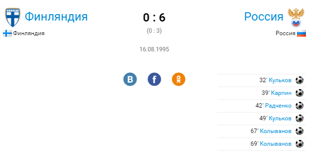 Финляндия – Россия 0:6 Финская команда в то время лидировала в отборочной группе Чемпионата Европы-1996, и разгрома никто не ожидал. Но команда Олега Романцева на этом этапе была неудержима. И в этом матче россияне сразу завладели мячом, планомерно осаждая ворота соперников. Однако форвардам никак не удавалось нанести точный удар, и тогда это сделал защитник Василий Кульков, открыв счёт в матче. Затем своё слово сказал Цымбаларь. Через две минуты после навеса Мостового отличился уже Радченко. Во втором тайме снова записал гол на свой счёт Кульков и дважды это сделал Колыванов. Сборная России триумфально вышла из группы, но в финальной части сыграла очень неудачно. Команда бесславно уступила в группе основного турнира сборным Италии и Германии, и только с чехами красиво сыграла вничью со счётом 3:3. Результатом оказалось последнее место в группе и восемь пропущенных мячей в трёх матчах. Россия – Андорра 6:0 (2011) Команде под руководством Дика Адвоката достаточно было в этом матче сыгра