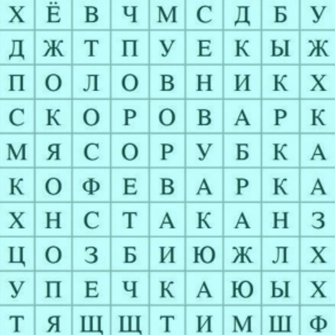 Привет всем! Предлагаю вашему вниманию тесты "найди слово". В первом тесте необходимо отыскать слова, связанные с кухней. Попробуйте найти от 5 и более слов за 30 секунд Тест № 1 Какие слова удалось найти? Какое количество слов нашли, напишите в комментариях) Тест № 2 Во втором тесте, нужно найти не менее 5 слов о зиме за 30 секунд Сколько слов удалось найти в 1 и 2 тесте? Подпишитесь на канал и поддержите публикацию лайком! Спасибо за внимание!