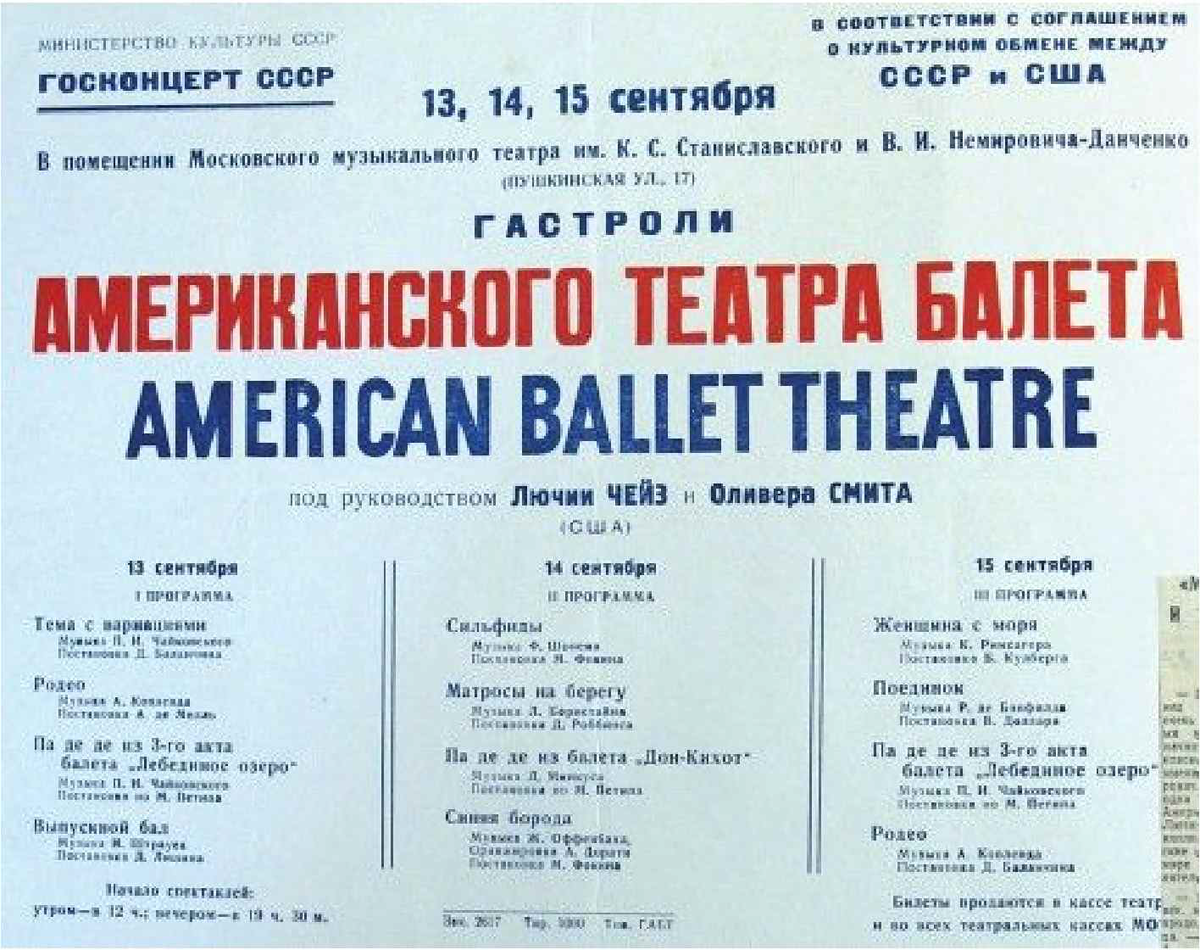 Неамерканский пласт программы был уступкой. Как было отмечено в первой статье, изначально руководитель АБТ Люсия Чейз планировала везти в СССР чисто американские постановки, однако встретила сопротивление как правления АНТА (органа, которому в рамках культурного обмена Госдеп США делегировал полномочия по принятию решений, непосредственно касающихся артистических вопросов, оставив себе вопросы логистики), посчитавшего, что такой подход обернется провалом, так и со стороны Госконцерта.