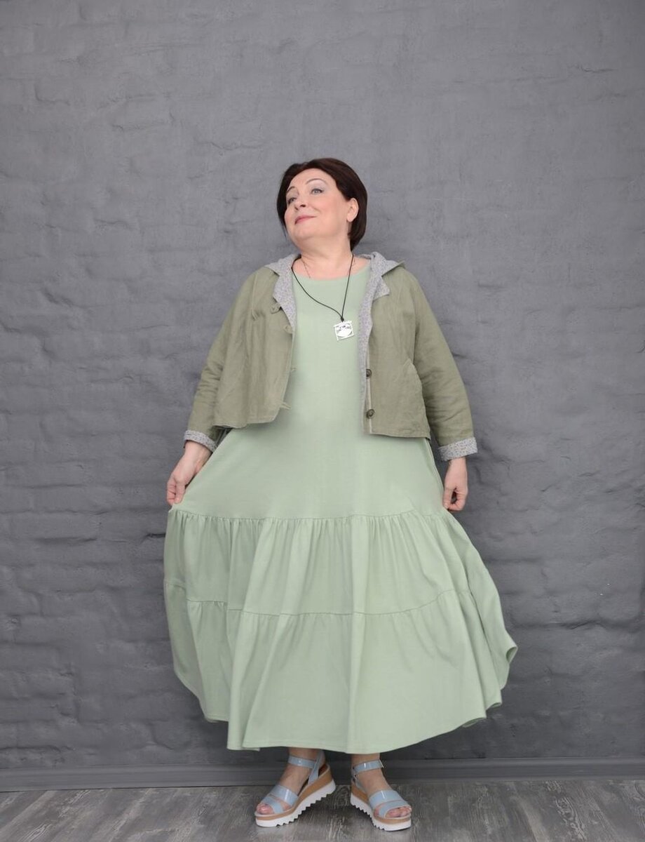 - Нежный образ в светлых оттенках серо-зеленого цвета. Длинное платье, отрезное по линии бедра с двухъярусной юбкой дополнено укороченной двухсторонней курткой. Использование куртки позволяет сохранить пропорции фигуры, несмотря на сильно заниженную линию талии. Дополнительная деталь – светло-серые босоножки на толстой подошве.
