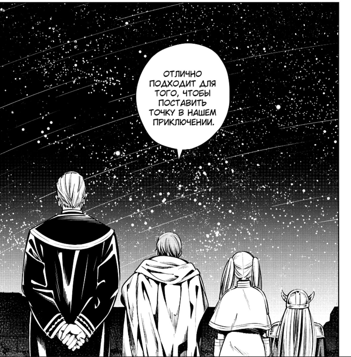 Данная манга ещё находится в онгоинге, поэтому разбора концовки не будет, если хотите перейти к мнению, то оно в конце статьи! Эта манга повествует нам о девушке Фрирен, которая путешествует по миру в поисках манги, вот однажды она вступает в команду героев, которых посылают на убийство владыки демонов. Безспойлерная зона! Манга начинается с того, как приключение заканчивается и герои расходятся, но перед тем как каждый пойдёт своей дорогой они смотрят на звездопад. Хочется сказать, что в манге большое количество грустных моментов, что однако подчёркивает и улучшает экшн моменты. После долгих странствий в 50 лет наша героиня, которая является эльфийкой возвращается в столицу для того, чтобы взять один из предметов, который взял на хранение капитан их команды, в это время все её сокомандники, а точнее воин человек, святоша и дворф уже постарели, но Фрирен говорит, что она с ними была мало знакома и эти 10 лет были даже не сотой частью её жизни, и что рано или поздно она проститься с ним