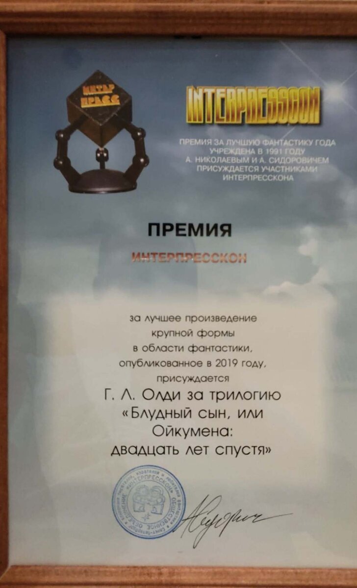 Роман Г. Л. Олди «Блудный сын» из космической эпопеи «Ойкумена» получил литературную премию в области фантастики «Интерпресскон-2021» в номинации «крупная форма (роман)». Ура, товарищи! И спасибо всем-всем: кто организовал, кто выдвинул, кто голосовал. Предыдущая наша история «Интерпрессконов», куда мы впервые приехали, считай, тридцать лет назад, такова: — роман «Ожидающий на Перекрёстках» занял 3-е место в 1996-м году; — рассказ «Смех дракона» стал лауреатом в 2011 году; — роман-трилогия «Побег на рывок» из космической эпопеи «Ойкумена» стал лауреатом в 2019 году. — И вот «Блудный сын» — лауреат 2021 года. Лауреаты «Интерпресскона-2021» в остальных номинациях: Средняя форма (повесть): Святослав Логинов «Вымертский тракт»