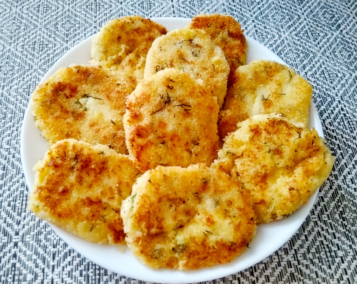 Столовой ложкой кладу тыквенную массу в сухари панировочные. Обваливаю ее со всех сторон и придаю форму котлеты. Выкладываю тыквенные котлеты на горячую сковороду с 30 мл. масла и обжариваю их с обеих сторон на среднем огне до золотисто - коричневого оттенка. Готовые тыквенные котлеты выкладываю на тарелку и подаю их со сметаной. Картофельные котлеты с сыром Картофель (400 гр.) отвариваю в мундире. Очищаю его от кожуры и перекручиваю картофель с 110 гр. сыра через мясорубку, либо можно натереть ка