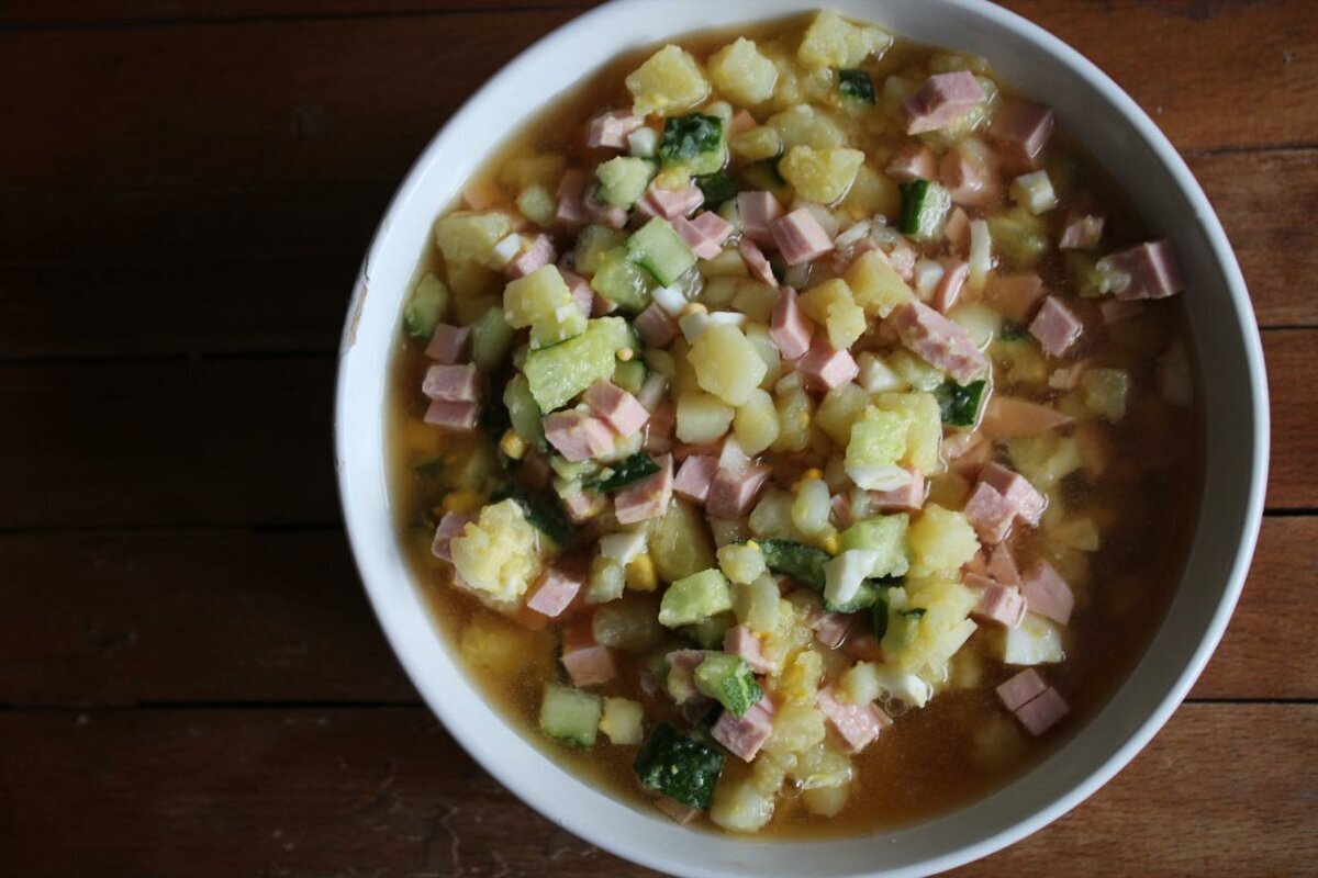 - Все хорошо перемешайте, посолите и залейте необходимым количеством кваса.