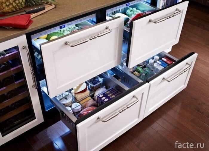 Домашний рефрижератор давно стал обязательной частью кухню. Хозяйки давно не ходят в погреб, чтобы снять с ледника продукты. Мы привыкли, что это прямоугольный шкаф обычно белого цвета. Однако маркетологи давно поняли, что, чем необычнее вещь, тем лучше она продается. Конечно, при условии, что она полностью выполняет свои функции. Горизонтальный холодильник Уже давно на рынке присутствуют встроенные модели аппаратов, где полки расположены горизонтально. Это отличное решение для хрущевок и малосемеек. При этом появляется еще одна рабочая поверхность для бытовой техники или нарезки продуктов. Охладитель для арбуза Watermelon cooler пользуется огромной популярностью в Японии. В принципе, там любят необычные аппараты. Вопрос только в целесообразности. Этот девайс рассчитан только на одну «ягодку». К тому же он имеет ограничение по габаритам. Поэтому какой-нибудь астраханский арбуз килограмм на 10, скорее всего, в него не влезет. Зато можно брать плод с собой на прогулку. У охладителя прис