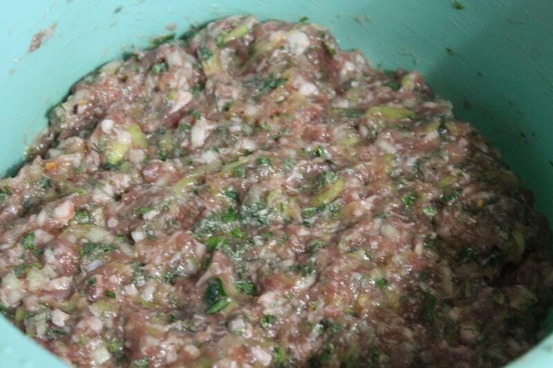 Фарш надо рубить, но... некогда же! Поэтому крутим на мясорубке всё, что надо прокрутить, добавляем воду и вымешиваем фарш до однородности и упругости.