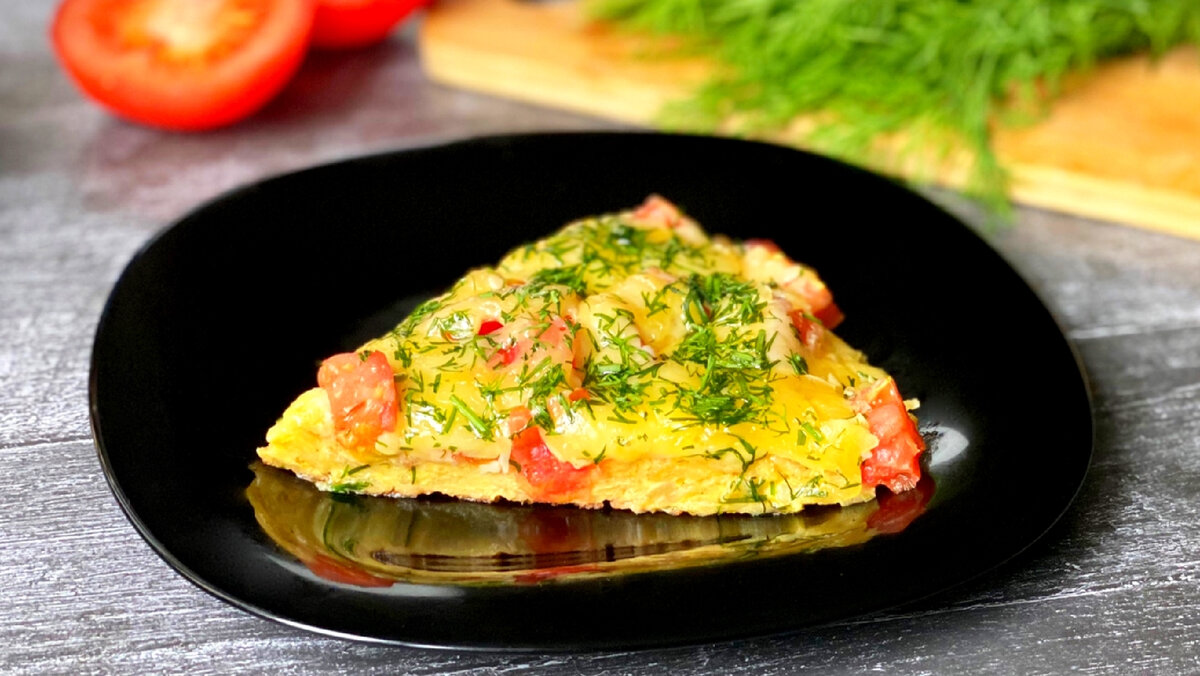Мои родные обожают этот завтрак. Сочетание всех продуктов даёт неожиданный результат. Каждый едок находит в этом рецепте своё любимое блюдо. Детям кажется, что это пицца, а мне напоминает сочный пирог, муж говорит, что по вкусу похоже на шаурму без мяса. В любом случае, это очень вкусно! Такой завтрак поможет всем быстро проснуться и зарядит энергией на долгое время. Короткое видео для удобства приготовления: КБЖУ на 100 г: Ккал - 168,6 Бел - 8,6 г Жир - 11 г Угл - 8,2 г Как приготовить: Половину тонкого лаваша сворачиваю в трубочку и нарезаю. Вбиваю в миску 3 яйца, добавляю 3 ст. л. сметаны, солю по вкусу и взбиваю вилкой. В яичную смесь перекладываю лаваш и перемешиваю. Помидор 1-2 шт. нарезаю на небольшие кубики, половину репчатого лука режу мелко, 80 г сыра натираю на крупной терке, укроп мелко рублю. В сковороде растапливаю 20 г сливочного масла и пассерую в нем лук. Как только лук стал прозрачным, перекладываю в сковороду лаваш с яйцами, сверху выкладываю помидоры и сыр. Все разр