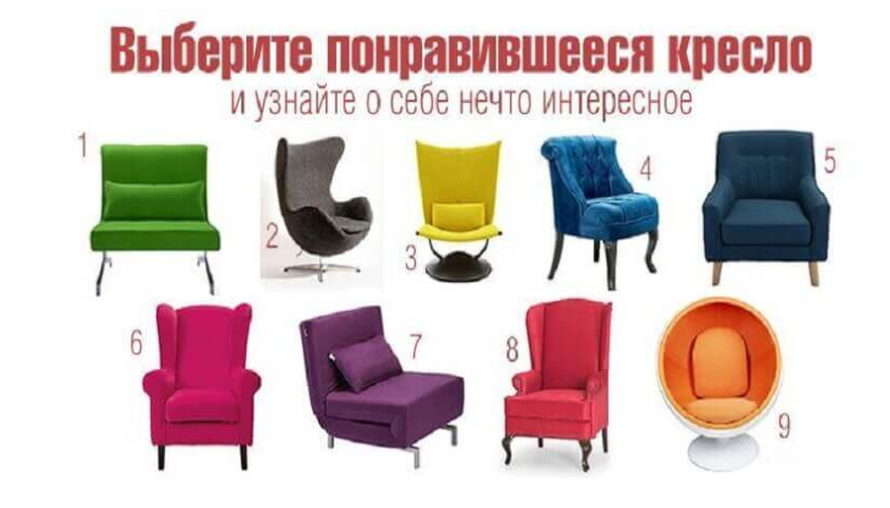 Приветствую вас уважаемые читатели и гости канала ✨Fitness Brain✨! Ну что дорогие мои друзья, майские праздники подошли к концу. Все набрались сил и готовы к дальнейшей работе, но и конечно не забываем познавать себя с помощью точных, визуальных тестов. Сегодня предлагаю пройти, простейший тест с креслами. Представьте, что вы пришли в мебельный магазин за покупкой кресла. Перед вами стоят девять кресел, осмотрев каждое из них, вы вдруг увидели, то единственное кресло, которое сделано именно для вас. Садясь в него вы чувствуете спокойствие, умиротворенность. А куда бы сели вы? Какое кресло вам больше всего приглянулось? Суть очень проста: выберите понравившееся кресло и прочтите описание ниже. Выберите кресло и читайте расшифровку. 1. Вы выбрали «Кресло бизнесмена» Вы — сильный и трудолюбивый человек. Можете целый день просидеть над трудным и нудным проектом. Трудоголик, но в отличие от большинства трудоголиков имеете здоровое отношение к работе. Вы никогда не боитесь высказать свое мне