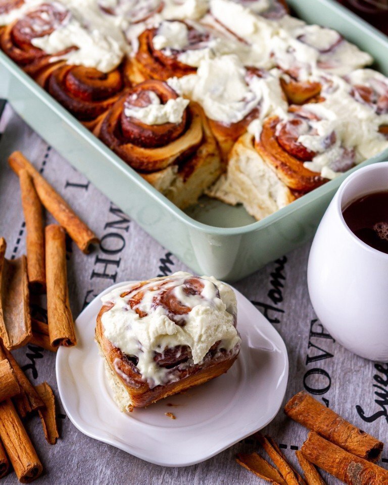1. В большой миске смешать половину муки и дрожжи. В маленьком сотейнике на среднем огне смешать 50 г масла, сахар, молоко и соль. Нагреть до температуры 50 °С (если нет градусника — это будет тот момент, когда масло полностью растает).