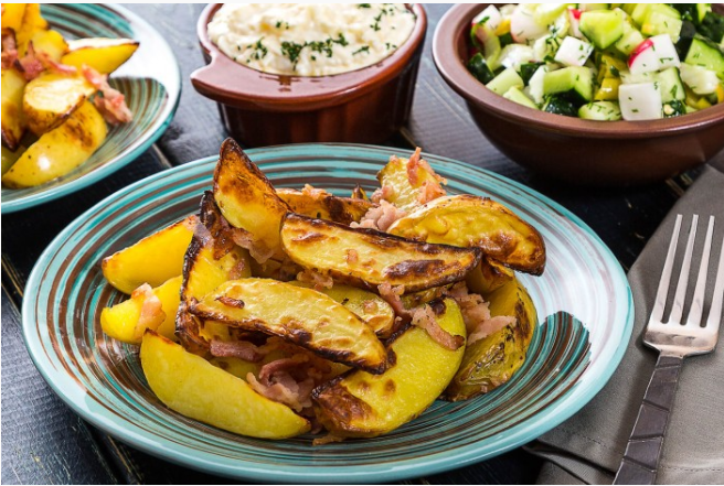 Картофель по-деревенски с беконом с сырным дипом и овощным салатом