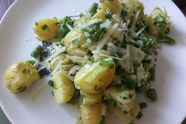 Вы можете взять 1 стакан готового песто, но вкуснее получается со своим! ИНСТРУКЦИЯ ПРИГОТОВЛЕНИЯ 1. Разрежьте неочищенный картофель на 4 части и отварите в кипящей подсоленной воде до мягкости примерно 10 минут. Добавьте нарезанную небольшими кусочками фасоль и варите еще 4 минуты. Слейте и оставьте остывать. Переложите в большую миску. 2. Тем временем, хорошо промойте базилик и измельчите в комбайне с чесноком, постепенно добавляя оливковое масло. Посолите и поперчите. 3. Перемешайте картофель и фасоль с песто. Добавьте уксус по вкусу, нарезанный зеленый лук, кедровые орешки, посолите и поперчите. По необходимости добавьте еще уксуса. Добавьте немного стружки пармезана и подавайте немедленно. Любите читать Дзен «Еды»? Расскажите свое мнение о материале в комментариях и ставьте свои лайки!