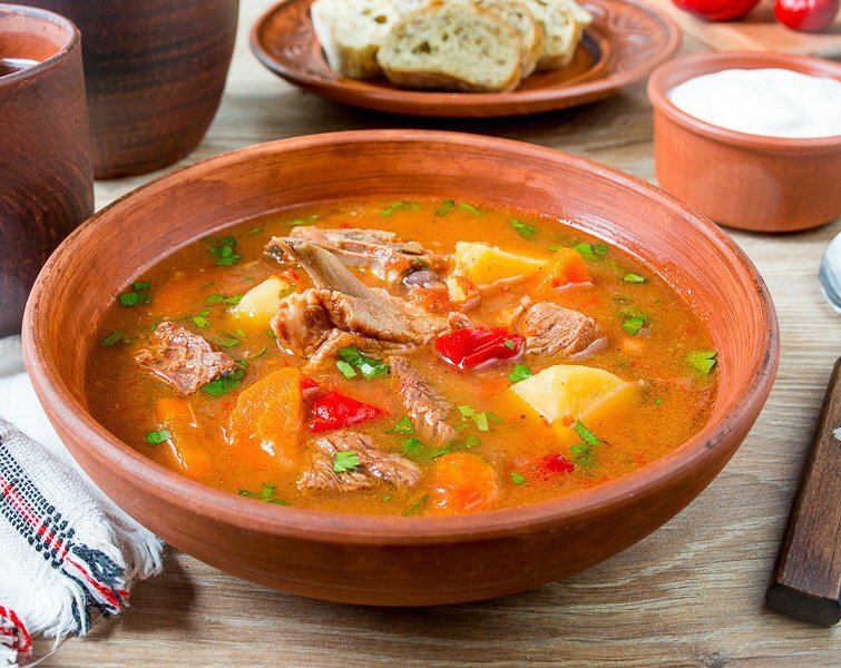 1. Бекон или сало нарезаем средним кубиком. Лук мелко рубим. Морковь нарезаем не очень мелко. Соразмерно нарезаем перец. Картофель режем крупно, на 4–6 частей в зависимости от размера. Мелко рубим чеснок и острый перец. Ребра разрезаем по одному, говядину нарезаем на среднего размера кусочки, на 1–2 укуса.