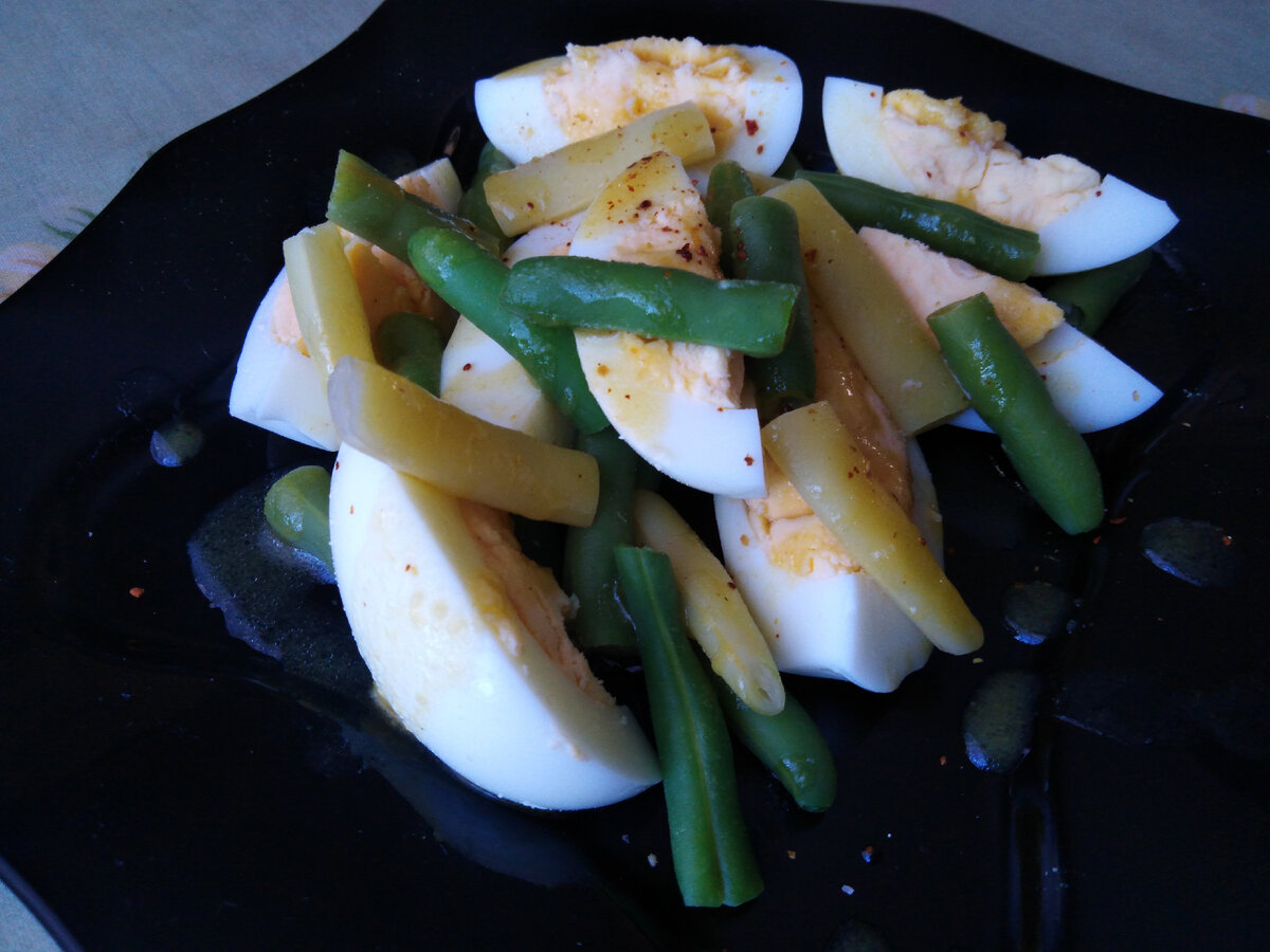 Всем привет! Меня зовут Андрей, и здесь я делюсь рецептами, которые, может, не всегда можно назвать полезными, но уж точно не вредными. Такую штуку на завтрак (а иногда и на ужин) я готовлю себе, когда не хочется ломать голову, что бы такого съесть, чтобы без тяжести в желудке, быстро готовилось и главное, чтобы было вкусно. Наверное, можно назвать это салатом. Есть его можно и горячим, и холодным. Готовится проще некуда, по сути, нужны всего лишь стручковая фасоль и яйца, при этом «штука» несмотря на свою диетичность действительно вкусная – вся фишка в соусе. Нужны: Яйца Стручковая фасоль Оливковое (растительное) масло Мед Горчица Лимон Паприка молотая Соль Яйца отварить вкрутую, очистить и порезать на четвертинки, фасоль сварить в чуть подсоленной воде и нарезать не очень мелко. Выложить все в одну тарелку, сдобрить щепоткой паприки. Теперь соус. Смешать в равных пропорциях оливковое (растительное) масло, мед, горчицу и лимонный сок. Чуть посолить, хорошо перемешать и выправить по св