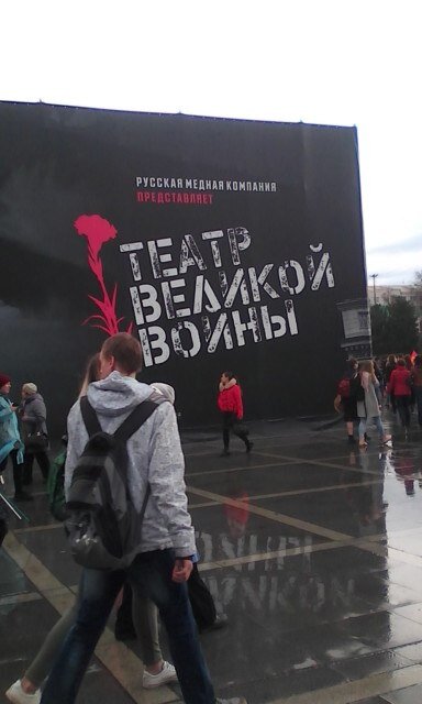 В последнее время часто обсуждается недопустимость использования лозунгов вроде "можем повторить", одевания детей в военную форму и наматывания Георгиевской ленточки на всё, что не приколочено и, вообще, превращения достаточно траурного дня во всеобщую пьянку/гулянку. В этом году на Плотинке появилась невероятная альтернатива, посвящённая памяти Второй Мировой войны. На месте водопада сделали театр, в котором показывали 15минутный бесплатный спектакль, который сопровождался видеорядом, посвященным тяжёлым событиям военного времени. Спектакль тяжёлый, детей до 12 лет на него не пускали. Хотя, с моей точки зрения, стоило сделать 16+. Правда, я сама в детстве чего только не смотрела, но не уверена, что сие пошло мне на пользу. Мне несказанно повезло, в кои-то веки я гуляла не одна, ребёнка у меня забрали и меня отпустили на просмотр (а часто в таких случаях приходится отказываться от посещения чего-либо, при этом недобрым словом поминая отца семейства). Вход в театр проходил через