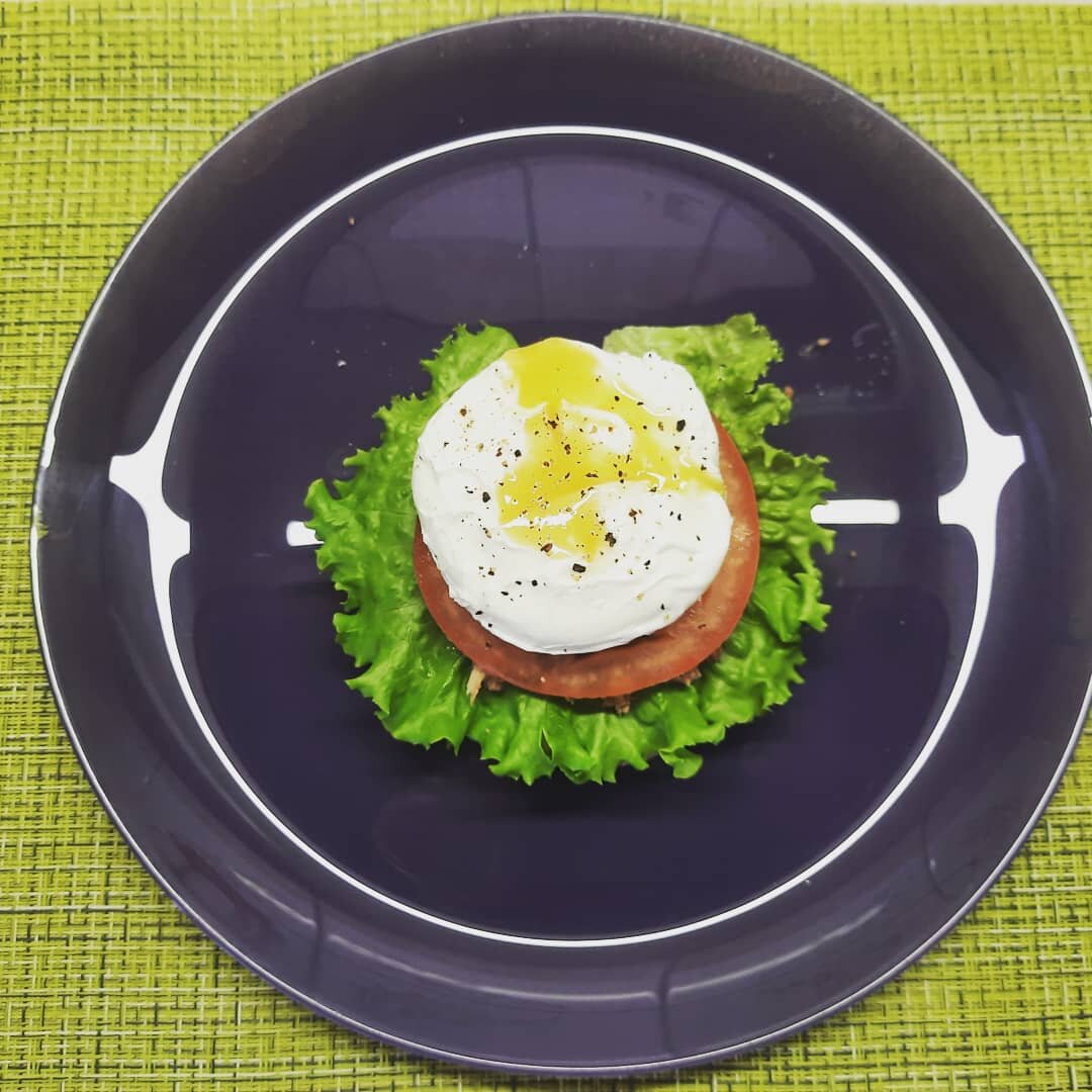 хлебец цельнозерновой -тунец в собственном соку -лист салата -помидор -яйцо пашот -оливковое масло и черный перец. Консервированный тунец для салатом смешиваем с небольшим количеством оливкового масла, перчим. На хлебец выкладываем слой тунца, затем лист салата и снова слой тунца, его накрываем кружком помидора. Сверху яйцо пашот, немного свежемолотого черного перца. Очень вкусно и сочно!!! Приятного аппетита!