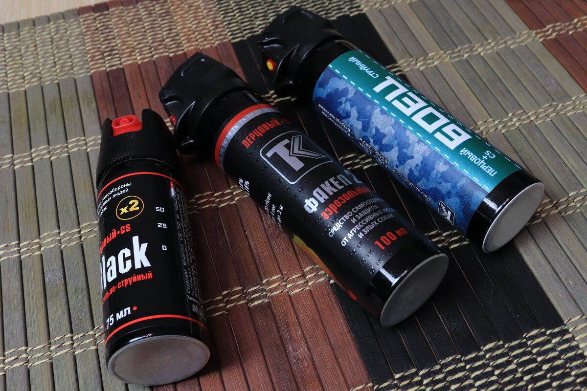 Перед нами три "техкримовских" перцовых баллона: аэрозольный "Факел 2" 100мл, струйный "Боец" 100мл, и аэрозольно-струйный "Black x2" 75 мл.