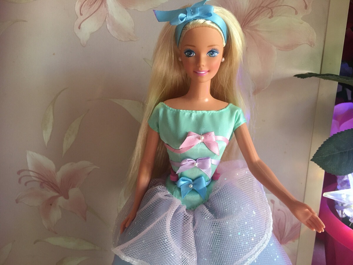 Другие обзоры Барби Супер Стар Барби Снежинка Барби Secret Hearts Барби "Стиль Голливуд" Барби Happy Holidays 1995 Barbie Twinkle Lights Вот такую нежнейшую красавицу, напоминающая "Алису в стране чудес" выпускала компания Mattel в 1997 году. Коробочка к ней была маленькая, мало презентабельная. Сама по себе куколка очень недорогая. В наборе к ней шел чайный сервис (поднос, чашки, блюдца, чайник) щетка для волос и туфельки в тон. Тело 1966 года... Волосы длинные, прямые и блестящие, просто горят на солнце. Платье многослойное, хорошего качества, отлично держит форму. На подкладке бирка фирмы. Украшения у куколки в виде жемчуга, что кольцо, что сережки. Макияж нежный, благодаря ему куколка просто очаровательна. Немного на нее со всех сторон можно посмотреть ниже. А у Вас есть куколки нежного стиля? Или может по памяти можете вспомнить, что еще было в 90-е для последующей покупки? Буду благодарна за комментарии