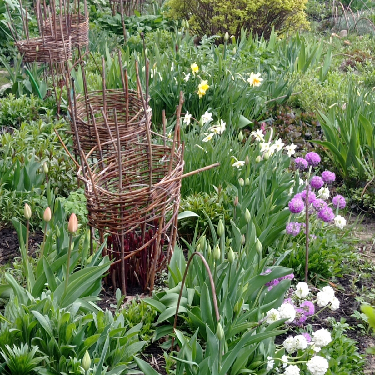 Если на даче в Карелии около Ладоги 8 мая еще шел снег, то в городе цветущая весна. Хочу показать вам немного фото клумб нашего двора. И обратите внимание на недорогие, плетеные из прутьев подставки-корзины для пионов. Я уже писала, что люблю природный стиль сада, из веток можно сделать, что угодно. Недорого, быстро и стильно. Недолговечно, но вечного вообще ничего нет. Ссылка на статью о садовых арках, калитках и пр. из веток. Цветут нарциссы и примулы Показались ростки пиона - красивая опора. Пион будет смотреться шикарно, букетом. Иберис Форзиция в цвету. Уже распустились цветы барвинка. Идеальное вечнозелёное растение для переднего плана миксбордера. И примулы всех цветов Наконец то весна.