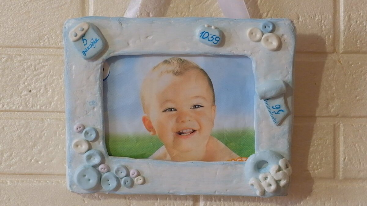 Оригинальный подарок! Фоторамка своими руками из картона с метрикой малыша. Декор шпатлевкой и фигурками из холодного фарфора Интерес появился тогда все этапы по порядку: 1. Отступаю по 5 мм, чтобы фотография могла держаться в рамке. Получается с каждой стороны по 2,5 мм, фото заходит за рамочку. 2. Отступаю по 3 см это и будет ширина рамки. 3. Вырезаю заднюю стенку рамки. 4. Понадобятся еще 3 внутренне полоски, шириной по 2,5 см. 5. Обматываю фольгой переднюю деталь, закрепляю нитками. Чтобы картон не размок и не покоробился от шпатлевки. Склеиваю все детали. 6. Наношу финишную штукатурку, пальчиками смоченными в воде, сглаживаю неровности. Оставляю сушится на 24 часа. 7. Замешиваю массу холодный фарфор: 2 ложки крахмала (для этих фигурок подойдет и картофельный) и 1 ложку клея ПВА. Обрабатываю обильно руки маслом и замешиваю. Масса должна тянутся. Тут как с тестом, жидко добавляем крахмал, густо добавляем клей. 8. Окрашиваю массу акриловыми красками. Лепим фигурки. 9. Обрабатыва