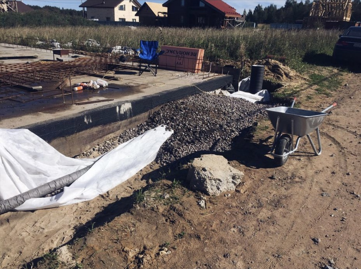Собственно, решено было заливать основание стен одновременно с бетонным въездом в гараж. Что бы все было «по уму», необходимо подготовить под въезд подушку и провести под ним дренаж, который должен присутствовать по всему периметру здания.