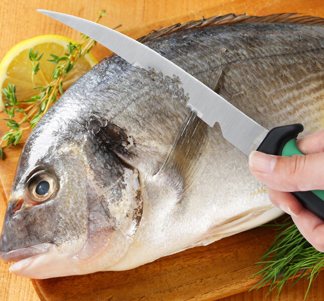 Блюда из рыбы пользуются огромной популярностью, чего не скажешь о процессе подготовки продукта к приготовлению. Чтобы разделка рыбной тушки не казалась «каторгой», был изобретен филейный нож, с которым работа идет на порядок удобнее и быстрее. Для некоторых новичков в кулинарии найти рыбный нож бывает несколько проблематично, так как многие ножевые инструменты для кухни имеют сходные характеристики. Кто-то считает, что данное приспособление вообще не обязательный атрибут, но те, кому обрабатывать рыбу приходится много и часто, знают, насколько полезен филейный нож. Конструктивные особенности ножа-филейника Как всякий традиционный ножевой прибор нож для разделки рыбы выполнен из двух элементов – клинка и рукоятки. Но требования к ним обладают характерными особенностями: У режущей части ширина меньше, чем у рукояти. По форме клинок вытянут по всей длине равномерно, острие удлиненное, прямое или чаще загнутое вверх. Не подходят для обработки рыбы ножи из керамики, хотя они и превосходно