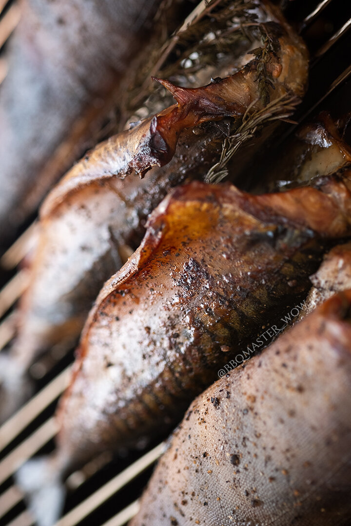 Ингредиенты: 2 шт. скумбрия 2 шт. терпуг 4 веточки свежего розмарина 4 веточки свежего тимьяна 4 поленца дров ольхи соль и перец по вкусу. ⠀ Подготовка: рыбу снаружи и внутри посолить, поперчить. Для эксперимента, в брюшко двух разных рыб я вложил свежий розмарин, а в оставшиеся две - свежий тимьян. Если времени вагон, отправьте просолиться на ночь в холодильник, есть нет - на 2-3 часов. Подготовить гриль-коптильню к работе 110-120 С. Емкость для жидкости заполнить наполовину. Прогреть коптильню 15-20 минут. С помощью нижних заслонок отрегулировать температуру. В спинку рыбы вставить щуп. Поместить рыбу на верхнюю решетку. Щипцами на разожженные брикеты через дверцу добавить 2 поленца ольхи. Оставшиеся 2 поленца положить через 30 минут. Коптить рыбу под крышкой до готовности примерно 1-1.10 часа или до температуры внутри самой толстой части 63 С. Подавать с пенным! P.S. в этом эксперименте мне больше понравилась рыба, в брюшко которой был вложен розмарин. Терпуг получился гораздо нежне