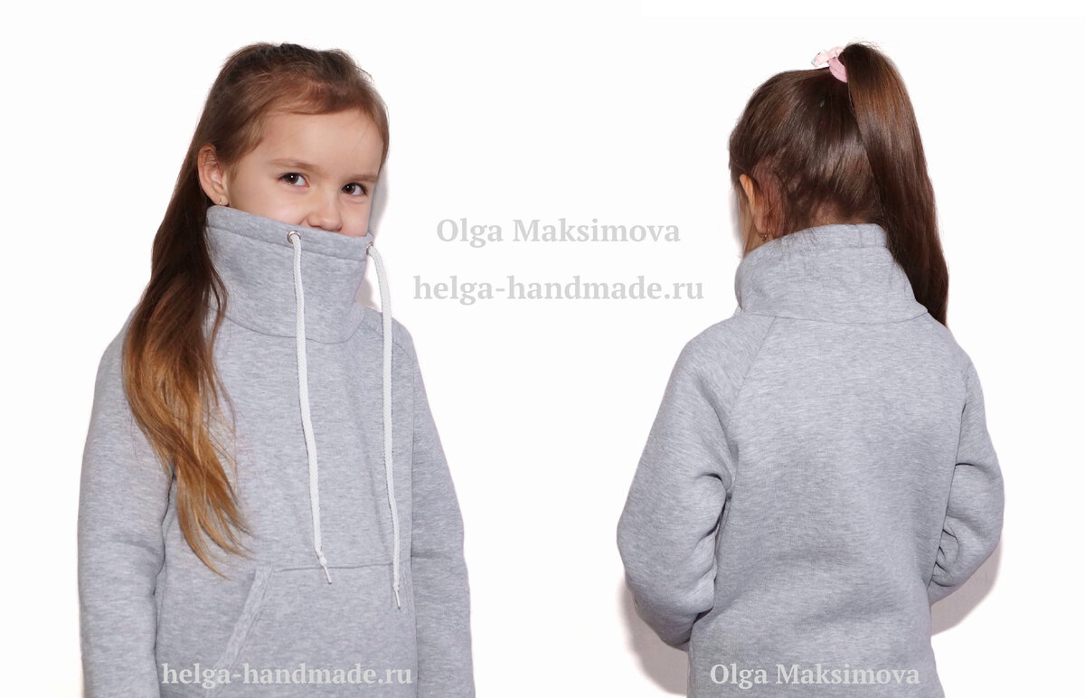 Высокий воротник-труба/ Воротник-стойка встречается на толстовках, свитшотах и тёплых трикотажных платьях. С ним тепло и удобно, а шить быстро и просто. Ранее я показывала как шить такой воротник из футера двунитки на подкладке, а сегодня покажу как его сшить из футера 3х-нитки с начёсом с кулиской под шнурок. Если шьёте из плотного трикотажа (футер 3х-нитка с начёсом или капитоний), то нужно немного углубить горловину (примерно 1 см по всей окружности горловины). Выкройку воротника-стойки строим по обхвату головы и кроим прямоугольник нужного размера. Его длина равна обхвату головы, а высота на ваше усмотрение. Для воротника высотой 10 см, у меня высота прямоугольника составила 14 см (где 4 см закладываем на подгиб для кулиски и на швы). Сгибаем полоску и стачиваем в кольцо, где отмечено клипсами для фиксации ткани. Если будете шить воротник со шнурком, то на этом этапе отмеряем место под люверсы или отверстия в кулиске. Для этого отмеряем от верхнего среза ширину подгибки для кулиски