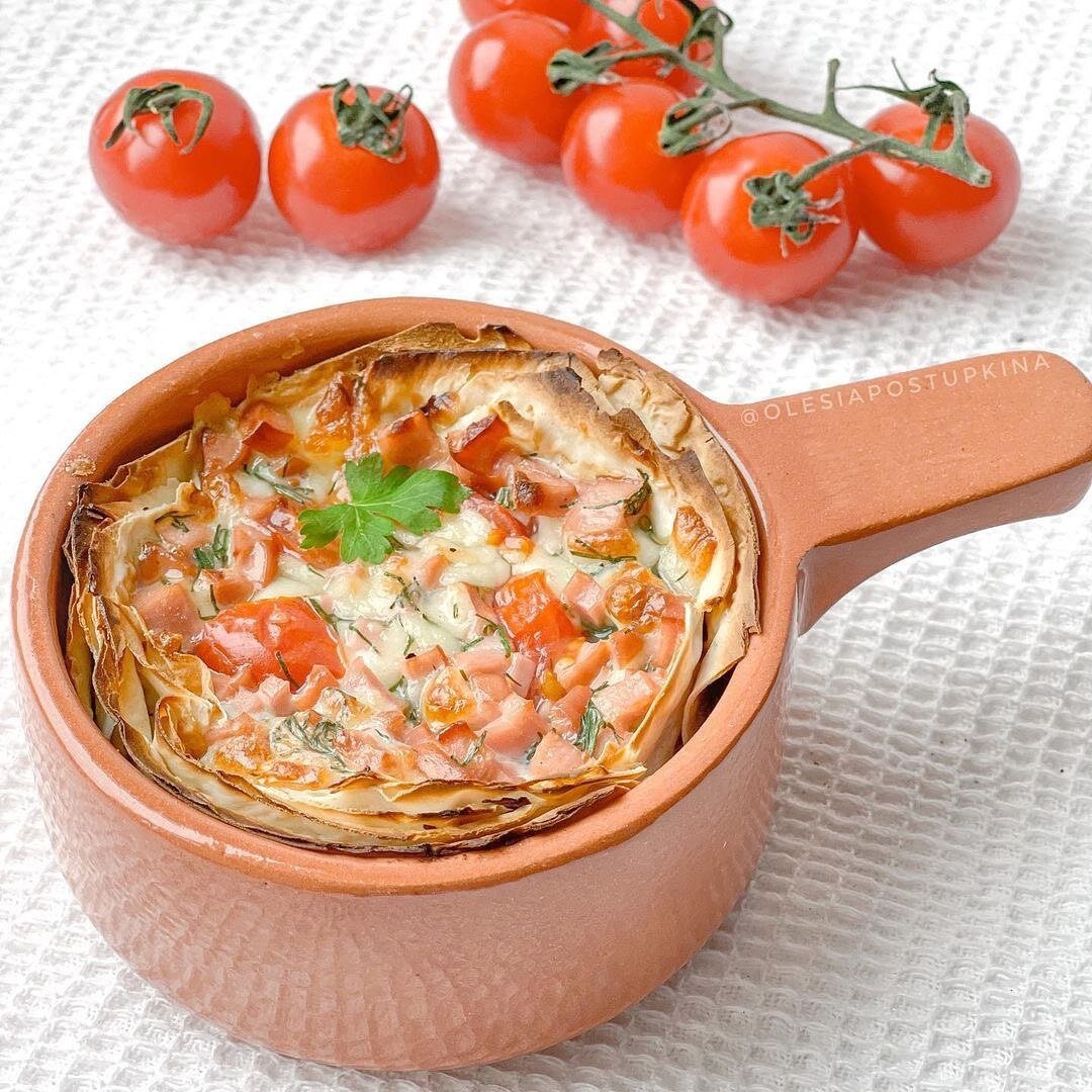 Ингридиенты: - 30г лаваша - 1 яйцо - 40г ветчины - 20г сыра - зелень - по желанию помидор, но смотрите, чтобы в нем было немного жидкости, она тут ни к чему - соль, перец. Приготовление: Берём небольшую формочку, при необходимости смазываем маслом. Можно в формах для кексов сделать. Из лаваша вырезаем два квадратика, вкладываем в форму, лишние края отрезаем ножницами и выкладываем на дно формы. Режем ветчину и зелень, трём сыр, смешиваем с яйцом, солим, перчим, выливаем начинку в форму с лавашом. Выпекаем до готовности в разогретой духовке на 180’, минут 10-15.