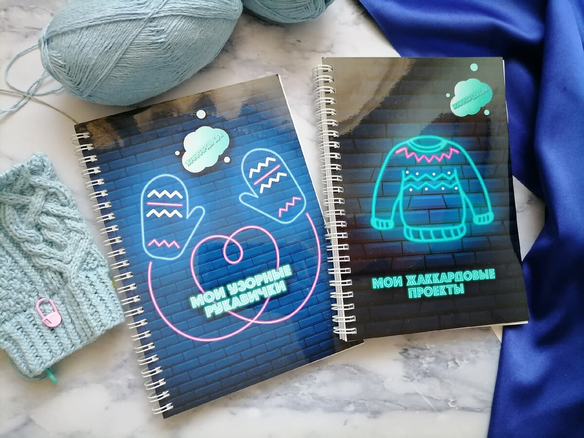 Всем привет! Я думаю вы не раз уже видели на просторах интернета похожие дневнички вязальщиц, возможно вы даже покупали их ранее и активно пользуетесь до сих пор. Но сегодня я покажу вам крайне интересные блокноты для вязальщиц, которые любят вязать варежки и любые другие проекты с жаккардом. Аналогов таких дневников для жаккарда и варежек я пока не встречала. Первое, что бросается в глаза - это красивая и заметная глянцевая обложка с неоновыми надписями- картинками на глубоком синем цвете: свитерок и рукавички на верёвочке (как в детстве). Милота! просто приятно держать эту обложку в руках. Внутри блокнотики разные по содержанию, но оба имеют 140 страниц на кольцах с местом для ваших вязальных проектов и пустыми схемами с клеточками для узоров жаккарда. 1. Рассмотрим по-подробнее первый блокнот: "Мои жаккардовые проекты". На обороте, на форзаце, вы найдете обращение от автора дневничков. Первые страницы блокнота с проектами выглядят так: есть место для написания всей необходимой инф