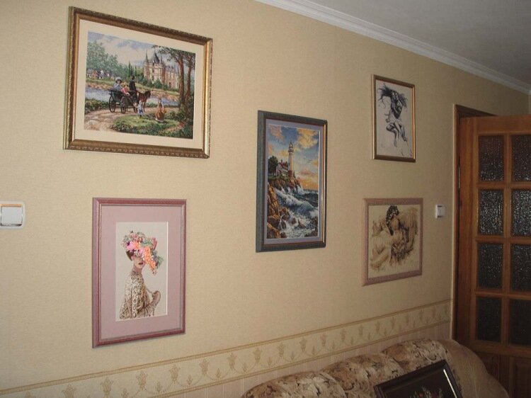 Глядишь, и сама начну оформлять наконец таки свои картины! Я всё ищу идеи, которые бы меня вдохновляли! Потому как просто взять оформить работы в багет и повесить на стену, не мой вариант. Мне хочется чего-нибудь интересного, чтобы картины не просто висели на стене, а были в гармонии с окружающей обстановкой. Пара слов приветствия: Покажу пример того, как мне не нравится: Вышитые картины, безусловно, красивые, но вот в целом всё выглядит не так, как мне бы того хотелось. Давайте же рассмотрим те варианты, которые мне показались наиболее привлекательными: Очень мне понравилась эта композиция: Шикарно смотрится! Для небольших и маленьких вышивок подходит просто замечательно! Обратите внимание, каждая картина имеет собственную рамку как по размеру, так и по цвету (некоторые совпадают). Но объединяет их одно - это общая цветовая гамма нейтральных оттенков. Вобщем-то, подойдет под любой интерьер, главное, чтобы стены были однотонного цвета. К такой красоте можно и оформить подушки.