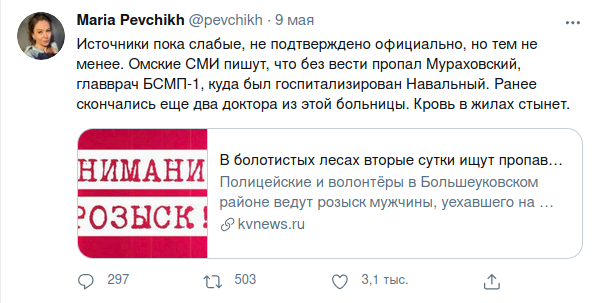 Если вы хотите создать новость буквально из ничего - можете смело обращаться к российским оппозиционерам! Они в этом деле просто мастаки! Это доказывает поддержание в инфополе Алексея Навального. Ничего с Лешей не происходит, но каким-то образом он постоянно держится в новостях, причем порой и в мировых... Мария Певчих, конечно же, именно та персона, которая будет в первых рядах переживать за экс-главврача... Но при этом она каким то образом первая заявила о "таинственном исчезновении", к тому же приплела других докторов из этой же БСМП? Совпадение? Для Машеньки уж точно нет! Все коварное ФСБ продумало! А за нашей бывшей агент_ессой из Ми6 подтянулись и другие псевдо-оппозиционеры... Теневой бухгалтер ФБК Леня Волков, почивая в Европе на донатных харчах, решил блестнуть своим чувством юмора. Вышло не очень, но ведь он и не комик вовсе. Так что простительно. Владимир Милов даже создал опрос среди своей аудитории в Твиттере, которая еще не пала жертвой жесткой модерации на аккаунте. Удив