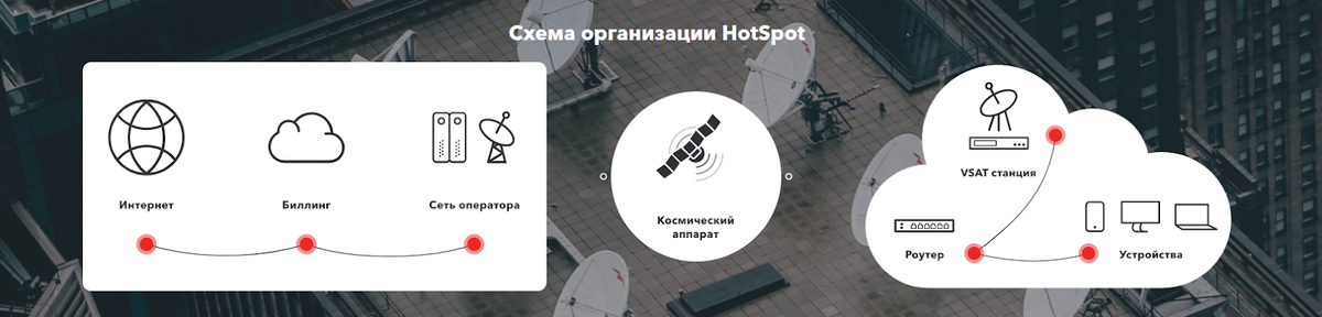 Антенна HotSpot принимает сигнал со спутника и направляет его на базовую станцию. Дальше сигнал переходит на роутеры, к которым подключаются конечные пользователи через Wi-Fi.