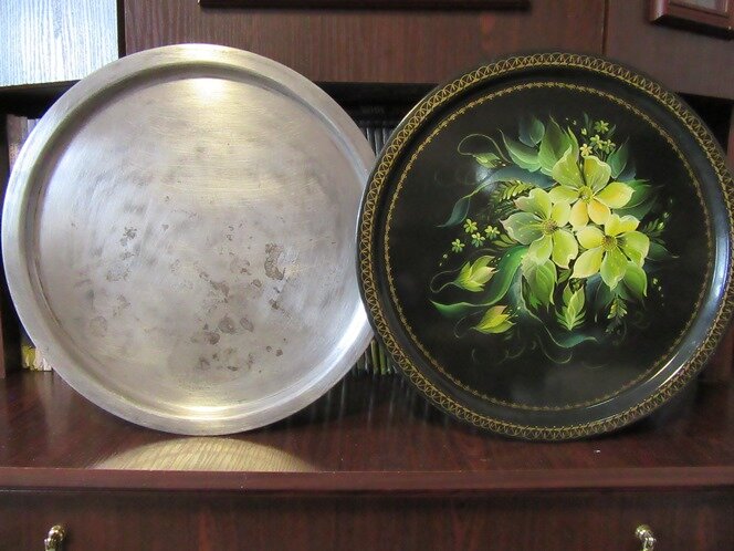 Сейчас сложно расписать новый поднос, потому что практически невозможно найти готовую металлическую заготовку. Деревянные еще продаются иногда, а металлические никто не штампует. Этот вид народного ремесла в данное время пребывает в глубоком ауте. Но возможно заново расписать старый изношенный поднос, которые иногда приносят друзья на реставрацию.