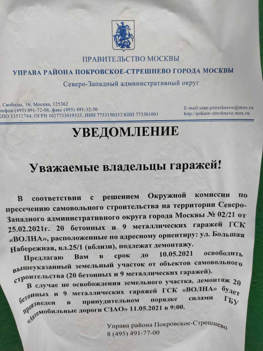 В пятницу, 30 апреля 2021 года, накануне майских праздников, получил коллективное обращение от инициативной группы представителей гаражно-строительного кооператива (ГСК) «Волна», расположенного в районе Покровское-Стрешнево, в котором говорилось о неправомерности принятых решений о сносе данного ГСК. Казалось бы, есть решение окружной комиссии по пресечению самовольного строительства и есть законные процедуры, что же тут может быть не так? Но в этой истории не все так просто. Заседание комиссии, на котором было принято решение о том, что гаражи подлежат сносу, прошло 25.02.2021. В письме заместителя главы управы района Покровское-Стрешнево города Москвы №297/21 от 21.04.2021 Председателю ГСК «Волна» предлагается в срок до 09.05.2021 освободить земельный участок, на котором расположены вышеуказанные гаражи, в противном случае их демонтаж будет произведен в принудительном порядке силами ГБУ «Автомобильные дороги СЗАО». С 24.04.2021 Управа начинает кошмарить развешанными объявлениями о т