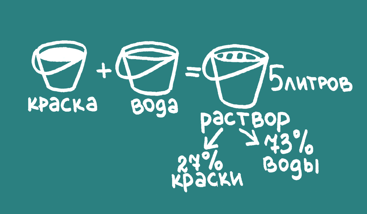 Привет! Проценты – достаточно важная тема, которая у многих вызывает вопросы. Задачи на проценты могут встретиться во второй части ОГЭ. Поэтому, чтобы они не застали нас врасплох, сегодня разберем одну из таких задач: В сосуд с 5 литрами 27-процентного раствора вещества налили 10 литров воды. Сколько процентов составляет концентрация получившегося раствора теперь? Решение без лишних пояснений ждёт вас в конце статьи) Давайте разберемся в ситуации. Что же такое 27-процентный раствор? Раствор состоит из вещества, которое растворяют (давайте в нашем случае это будет краска), а также жидкости, в которой его растворяют (примем эту жидкость за воду). Вообще лучше длинные термины, в которых можно запутаться, заменять на привычные нам в быту слова: так решать и легче, и веселее) Итак, весь раствор краски - это 100%. Из этих ста процентов какая-то часть приходится на воду, а какая-то часть – на краску. Если раствор 27-процентный, то это значит, что краска составляет 27% от раствора, а остальные