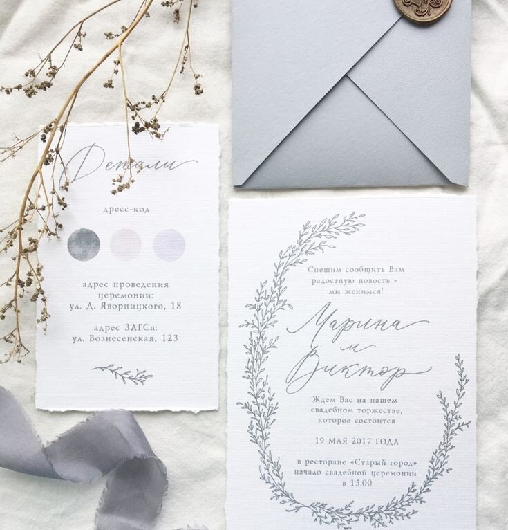 Для гостей свадьба начинается с приглашений. Но не переусердствуй, пытаясь отразить в одной карточке стилистику и концепцию всей свадьбы: самое важное в ней — не рисунки и шрифт, а сам текст. Если из-за большого количества декора или сложной каллиграфии он становится нечитаемым, смысл приглашения теряется.