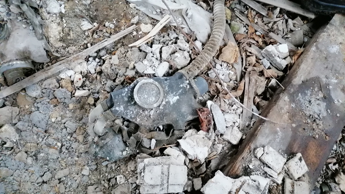 В жилой деревне в густых зарослях в заброшенном доме нашли много противогазов и телевизор