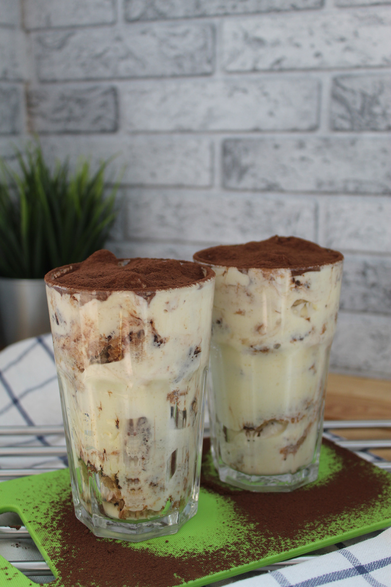 В любой емкости собираем десерт. Сначала крем,потом печенье ,пропитанное в кофе ☕,сверху присыпать щедро какао или тертым темным шоколадом🍫. Повторить слои.