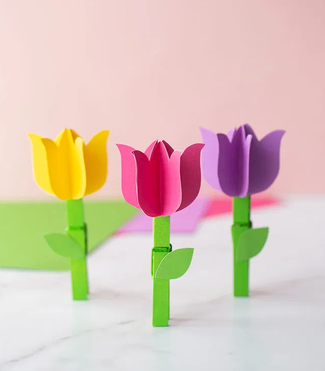 Сегодня у нас отличная инструкция для детей по изготовлению тюльпанов на прищепке. Все необходимое: Первым делом покрасьте прищепки в зеленый цвет. У нас были деревянные прищепки. Вы вполне можете использовать пластиковые уже готового зеленого цвета. Теперь распечатайте шаблон тюльпана, вырежьте его и перенесите на цветной картон. Нам понадобится таких три штуки одного цвета. Вы можете заранее сделать по три штуки разных цветов. Сверните каждый шаблон пополам. Склейте их вместе, чтобы получить объемный цветок. Мы сделали сразу три заготовки. Возьмите зеленый картон и вырежьте из него три небольших листика, затем приклейте их к прищепкам. Теперь приклейте тюльпаны к прищепкам. Мы просто приклеили конец прищепки к одной из сторон цветка. Тюльпаны готовы и даже могут стоять на столе.