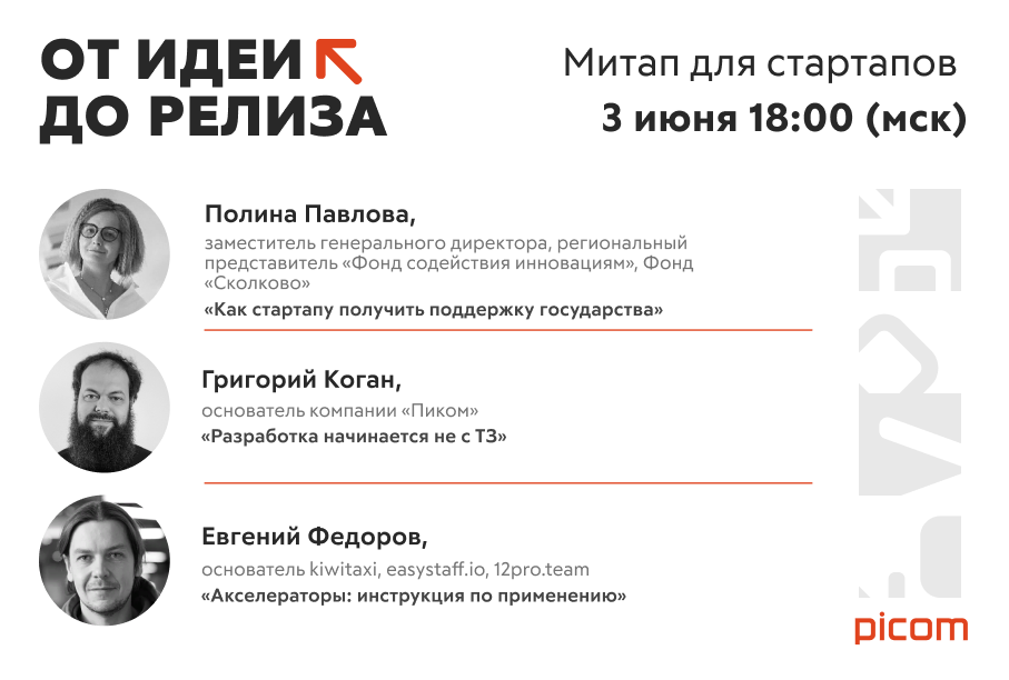 Открытый онлайн-митап, на котором наши эксперты и партнеры расскажут о том, как сэкономить время и деньги при запуске технологического стартапа, быстрее выйти на окупаемость и масштабировать идею. Кому будет полезен вебинар? 1. Тем, у кого уже есть свой стартап. 2. Тем, кто только собирается открыть свой бизнес. 3. Тем, кто ищет инвестиции для собственного проекта. 4. Продакт-менеджерам, руководителям, отвечающим за развитие бизнеса. Спикеры: 1. Полина Павлова, заместитель генерального директора, региональный представитель «Фонд содействия инновациям», Фонд «Сколково» «Как стартапу получить поддержку государства» 2. Григорий Коган, основатель компании «Пиком» «Разработка начинается не с ТЗ» 3. Евгений Федоров, основатель kiwitaxi, easystaff.io, 12pro.team «Акселераторы: инструкция по применению» Как принять участие: Ссылка на регистрацию: https://picom.timepad.ru/event/1622123/
