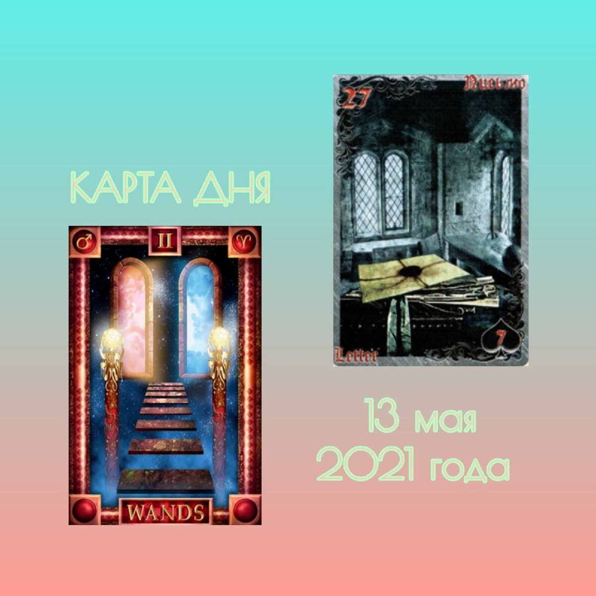 Возможно для достижения успеха нам необходима некая дополнительная информация или оформление бумаг. Карта Письмо из колоды " Тайны старого замка" готического оракула Ленорман как раз обещает нам, что нужное мы узнаем и получим необходимую документацию. День может быть насыщен информацией, перепиской, сообщениями.