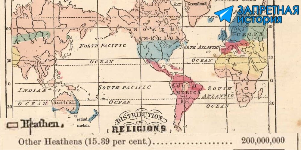 Атлас 1865г показывает распространение религий в мире. Кроме Северной Америки, большая часть современной России на середину 19в показана в цвете "heathen" - язычники. Мало того, доля язычников в мире составляла 15,3% или 200 000 000. Причем, Россия, Сибирь и Тартария здесь представлены отдельными странами.