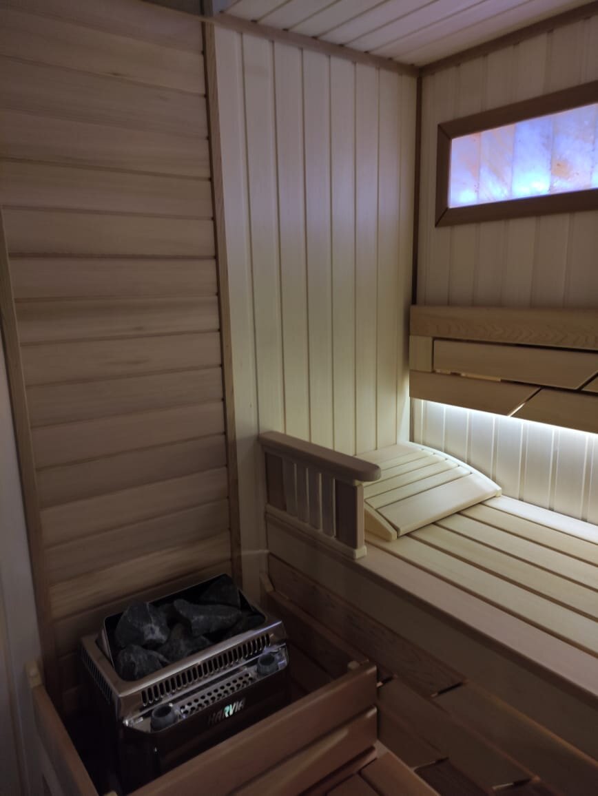 Где-то в этой сауне восхитительно сочетаются липа с кедром на стенах, гималайская соль и прекрасная электрокаменка с парогенератором. 👍