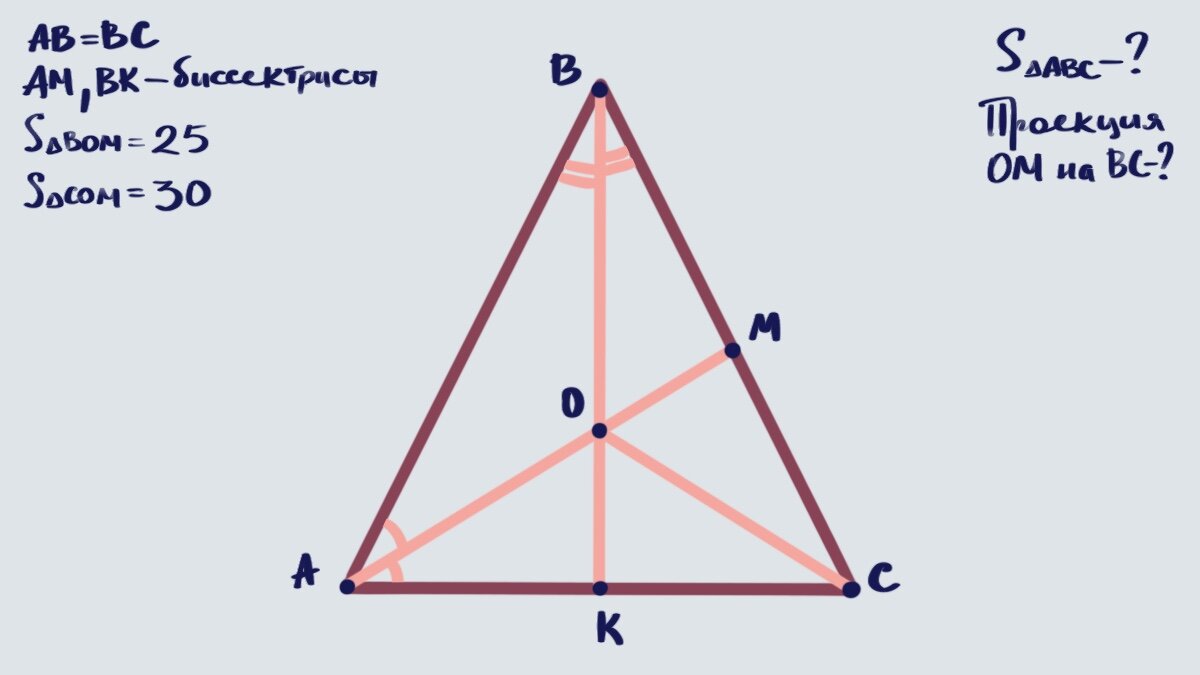 Треугольник для разнообразия и никаких трапеций. Ещё метод площадей или пропорциональные отрезки или всё это вместе в одной непростой, но интересной задаче для подготовки к ОГЭ Тут и свойство биссектрисы, и свойства (оба) равнобедренного треугольника, и отношение сторон (площадей), и даже «египетский» треугольник. читайте условие, если недостаточно — в конце подсказки тоже читайте. Условие В равнобедренном треугольнике ABC (АВ = ВС) биссектрисы AM и ВК пересекаются в точке О. Площади треугольников ВОМ и СОМ соответственно равны 25 и 30. Найдите площадь треугольника ABC и проекцию отрезка ОМ на прямую ВС. Подсказки Сперва найдём площадь треугольника. Вспомним, что биссектрисы треугольника пересекаются в одной точке. И если точка O – точка пересечения двух биссектрис, то третья это CO. Значит площади треугольников AOK и KOC – равны. А ещё равны площади треугольников ABO и BOC. Площади треугольников ABM и AMC относятся как их основания BM и MC или как AB и AC (знаете почему?). А площади