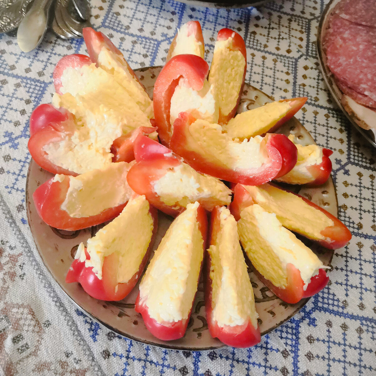 Всем привет. Сегодня я поделюсь с вами в очень вкусным и быстрым рецептом, который можно приготовить буквально за 10 минут и порадовать своих гостей. Ингридиенты 3шт болгарского перца 200гр твёрдого сыра 3 шт. вареных яйца 3 зубчика чеснока. Майонез или сметана Болгарский перец очищаем от сердцевины и разрезаем пополам. В отдельную миску натираем сыр, варёные яйца, пропускаем через пресс чеснок. Добавляем майонез и все перемешиваем. Чайной ложкой плотно набиваем наши половинки болгарского перца, каждую половинку плотно упаковываем в пищевую плёнку и убираем в холодильник минут на 15. Затем каждую половинку нарезаем на дольки. Закуска получается очень вкусной а, также для цвета и вкуса можно добавить в неё Укроп.