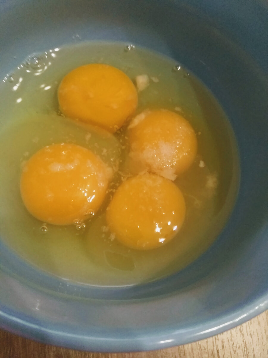 1) Берем глубокую тарелку или миску и разбиваем в нее яйца. Добавляем щепотку соли.
