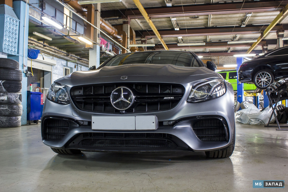 Традиционно хорошего настроения нашим читателям! Наш сегодняшний герой - "заряженный" седан AMG E63s. Автомобиль имеет, несомненно, выдающиеся технические характеристики, однако речь сейчас вовсе не об этом. Целью обращения к нам было изменение цвета накладных элементов с хрома на матовый чёрный, установки карбоновых деталей, оклейка кузова матовой пленкой, а так же установка воздуховодов с подсветкой от CLS.Для начала снимаем все элементы которые будут перекрашены и отправляем их в емкостъ для химического снятия слоя хрома, далее эти же детали отправятся на покраску. А в это время займемся защитой лакокрасочного покрытия автомобиля путем оклеивания его антигравийной пленкой. Для этих целей наши мастера используют полиуретановую пленку американской фирмы Suntek, которая имеет долговечный срок зашиты родной краски авто и при необходимости может быть удалена без следов клея. А так же еще и для защиты радиаторов от камней, насекомых и прочего крупного мусора в передний бампер были устан