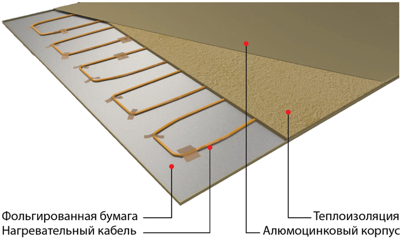 Панель имеет теплоизолирующее высокопрочное основание, предотвращающее потери тепла через основания, на которые крепится панель. Внутри находится нагревательный кабель в специальной, усиленной изолирующей оболочке. Корпус и лицевая поверхность выполнены из алюмоцинкового сплава Galvalumeобеспечивающего быстрый и равномерный нагрев панели. Толщина листа равна 0,7 мм.
